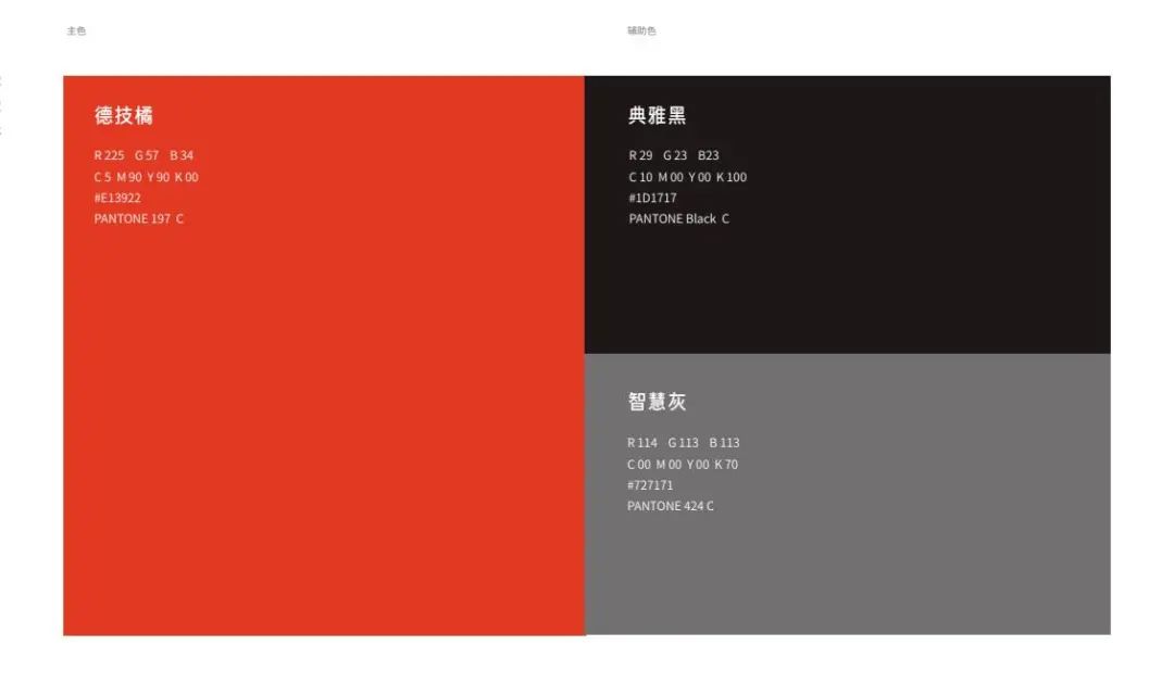 “德技橘”是德技优品门窗的最易被识别的视觉资产,与代表安全、技术、定制的“典雅黑”、“智慧灰”共同作为辅助色,进行点缀,增加了品牌整体的活力和底蕴,使整体视觉识别体系更加醒目,激励人心。